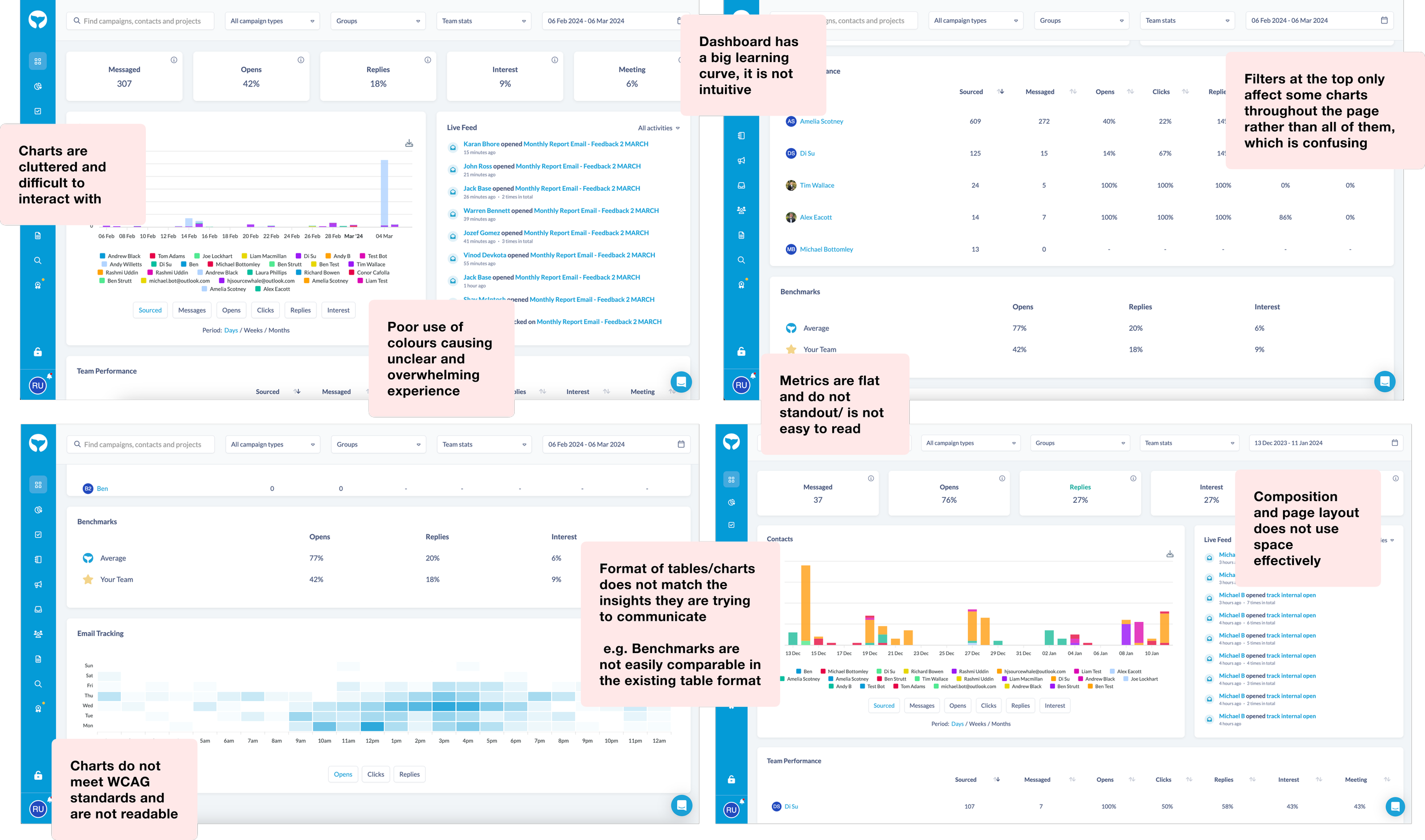 SourceWhale is a recruitment engagement platform used by agencies to track outreach, performance, and daily activity. The original dashboard—built primarily by engineers—provided functionality but lacked clarity, usability, and visual cohesion.