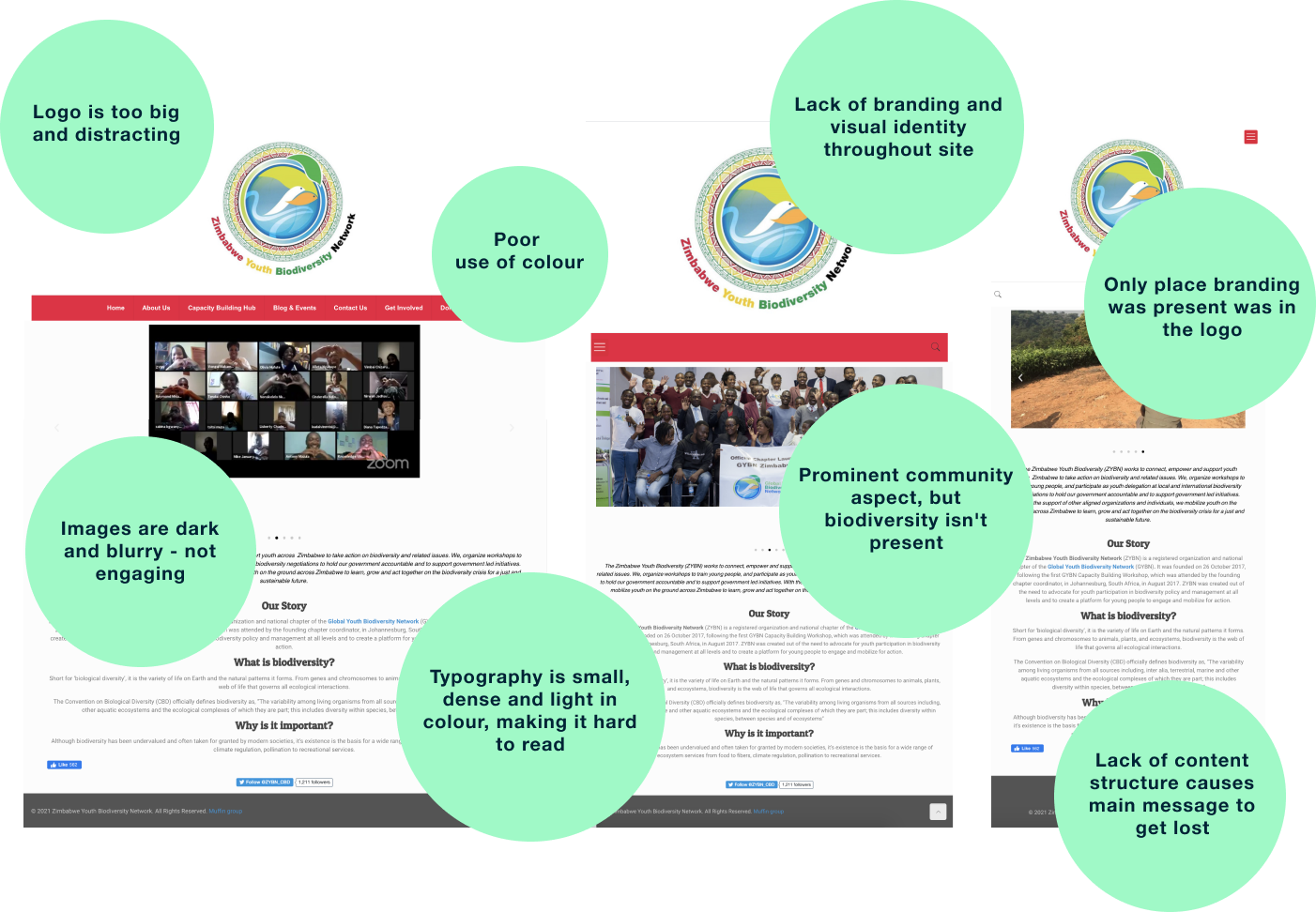 ZYBN’s values lacked presence throughout the whole site. Whilst youth and community were vaguely represented through the poor images on the site, biodiversity was not visually represented at all, it was only represented in the heavy blocks of text. As a result, the design challenge became clear: